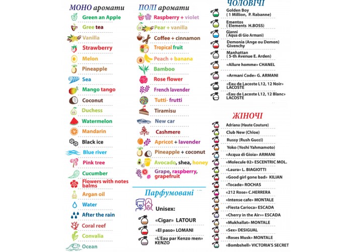 Ароматизацію можна замовити двокомпонентну або обрати орієнтальний аромат з каталогу. Вартість складних ароматів та створення індивідуальних ароматів рахується індивідуально.