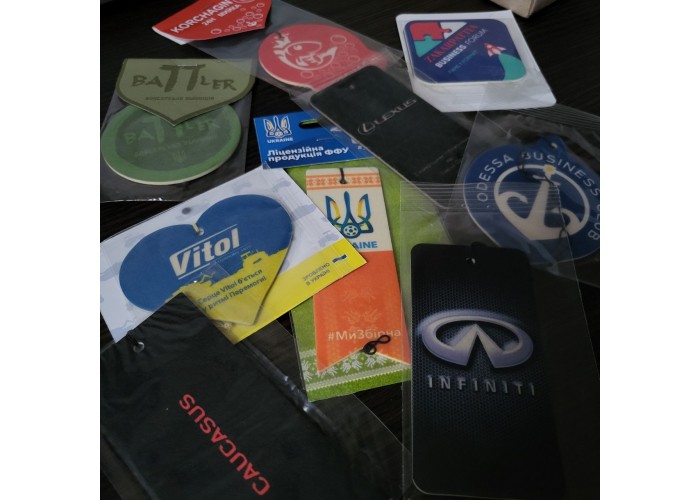 Найпоширеніше застосування візитки з ароматом - це друк ароматизаторів у машину з логотипом. Автомобільні ароматизатори з логотипом влучне рішення для служб таксі, автосервісів та автомийок. Ароматизатор у машину з логотипом не викинуть у смітник. Ароматизатор у машину з логотипом разом з ароматом просуває і ваш бізнес. Але ароматизатори з логотипом це не тільки автомобільні ароматизатори з логотипом на замовлення.