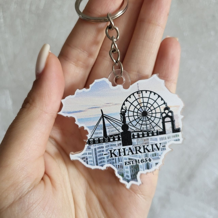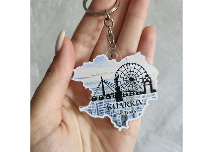 Брелок Харків - невеликий сувенір з Харкова, виконаний у формі мапи незламного міста героя. Інтернет магазин "Фарби життя" пропонує лишити на згадку про Харків не тільки спогади, але й купити сувеніри з Харкова на згадку про наше героїчне місто.