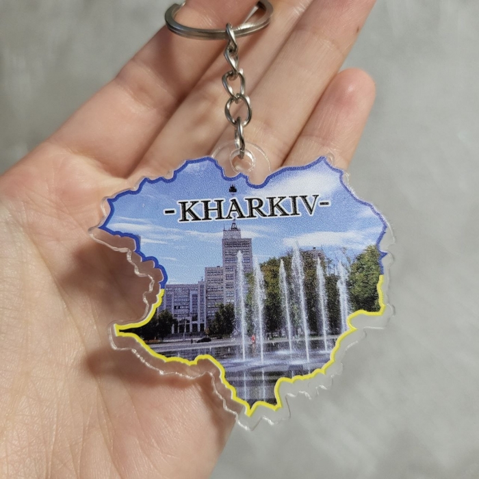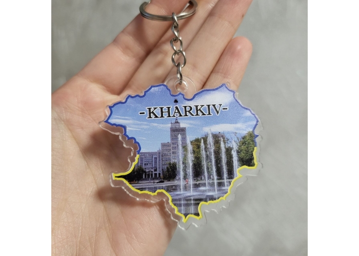 Сувенірний брелок виконаний з прозорого акрилу. На лицьовій стороні зображені основні видатні місця міста Харкова. Кріплення можна обрати у формі кольчуги або невеликих ланцюжків.