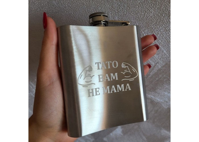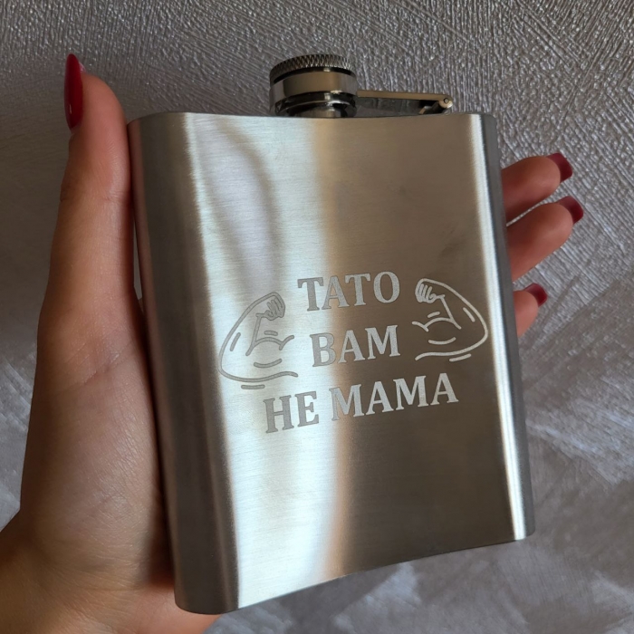 Іменна фляга з текстом Тато Вам не мама, нанесеними методом гравіювання – чудовий спосіб підкреслити власну індивідуальність та статус.