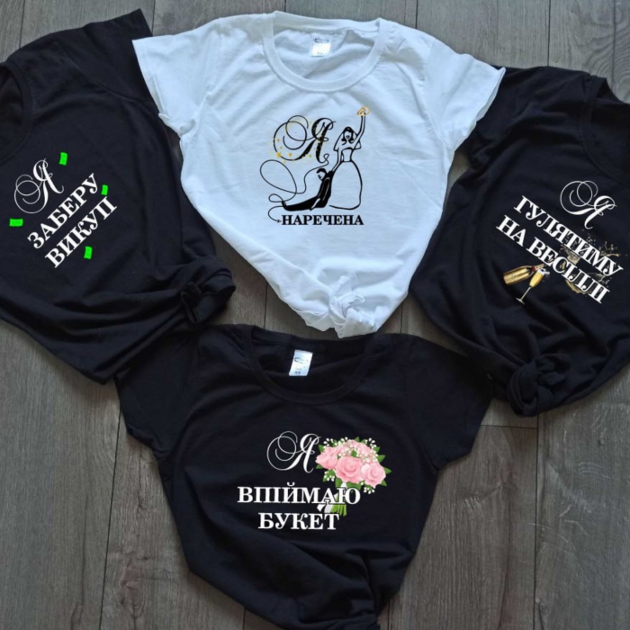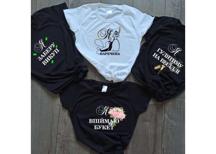 У нас можна не тільки замовити найкращі футболки для дівич-вечора, але й надрукувати на футболці будь-який текст чи картинку. Наша галерея футболок для дівич-вечора у Вас перед очима: оригінальний дизайн та прикольні написи на футболках доповнять та прикрасять це свято. За допомогою наших футболок легко дізнатися, хто тут наречена, і що думають її подруги на найкрутішій вечірці перед заміжжям! Малюнки та написи на макеті показані схематично, Ви можете поміняти розташування напису (картинки) на футболці (наприклад на спину або з двох сторін) або доповнити її.