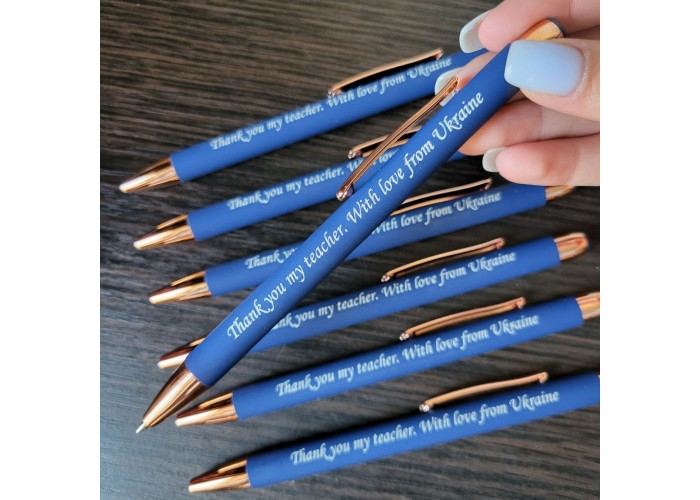 Написи на ручках робляться за допомогою лазерного гравіювання, завдяки якому вони не стираються і не зникають з часом. Колір тексту на ручці Ви не вибираєте, він буде такий як на фото (біло - сріблястий). На більш насичених кольорах корпусу ручки написи виглядають більш контрастно, більш ніжних тонах (блакитний, рожевий, срібло) менш яскраво.