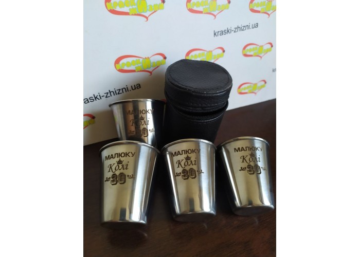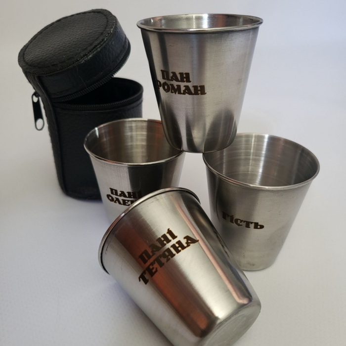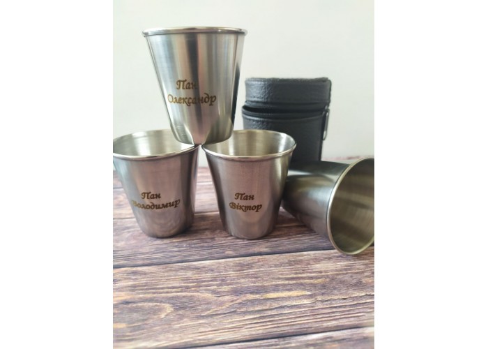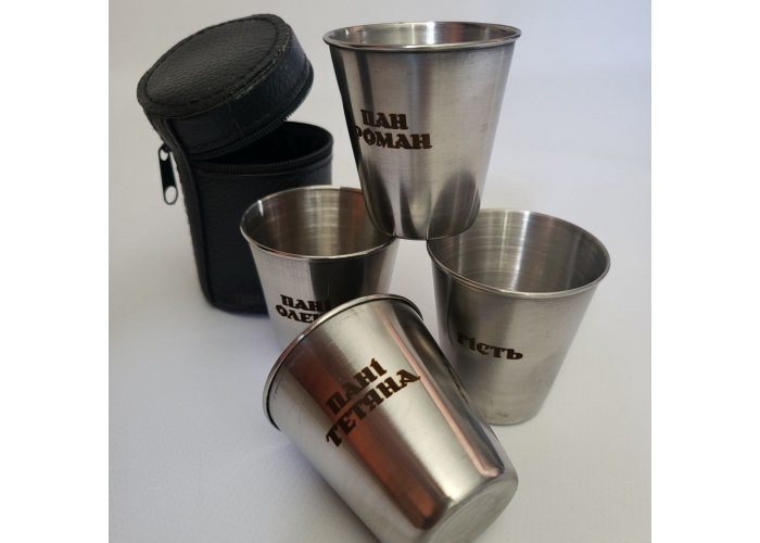 У вартість входить комплект з 4х чарок у шкіряному чохлі та гравіювання 1 сторони кожної чарки змінним текстом.