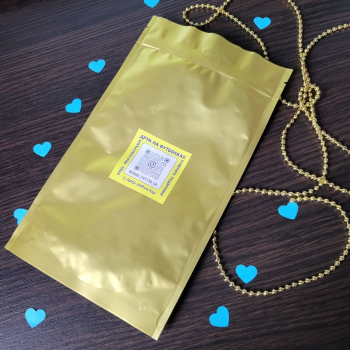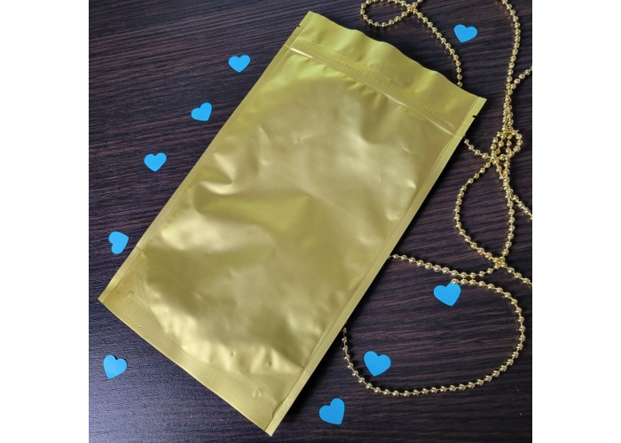 Бюджетний варіант подарункового пакування - пакет дой - пак золотистого кольору. Пакети дой-пак за звичай використувують для пакування солодощів, чаю, кави або інших сипучих продуктів.