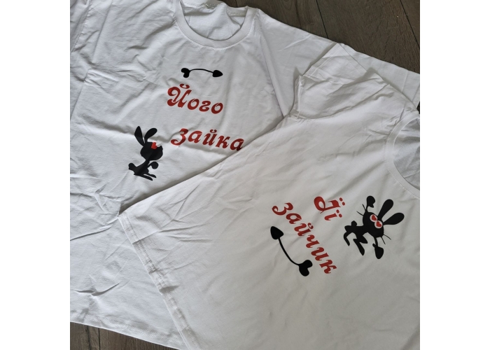 Ціна вказана за комплект із двох футболок. Макет зроблений у стилі футболки family look, що підкреслює єднання двох люблячих сердець. За Вашим бажанням, текст на футболках можна міняти. Футболки для пари зроблені зі 100% бавовни, це стильні та приємні на дотик речі, нанесення витримує понад 50 прань. Розмір друку до формату А4. Ви можете замовити друк більшого формату, додатковий друк на грудях, спині, рукавах та/або одночасно на всі три місця, під запит вартість буде перерахована.