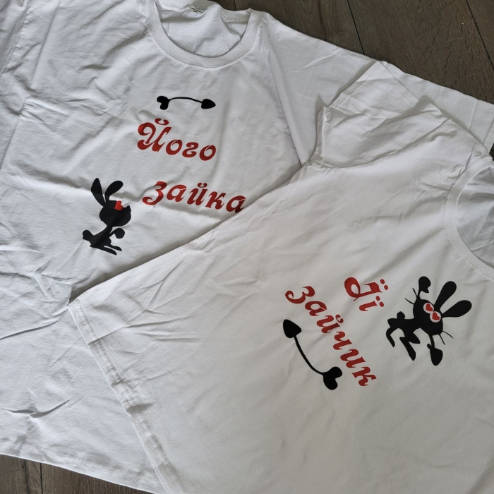 Парні футболки Його зайка та ЇЇ зайчик - хороший і практичний подарунок для двох. Це креативні футболки для закоханих, котрі приємно одягати на відпочинку, використовувати на фотосесії, а потім із задоволенням носити кожен день.