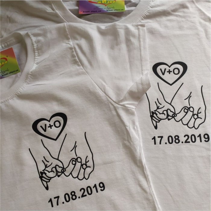 Футболки для пари зроблені зі 100% бавовни. Це стильні та приємні на дотик парні речі. Друк витримує понад 50 прань. У вартість входить розмір друку до А4 формату. Колір футболки та тексту показаний схематично, можливе індивідуальне доопрацювання макета за Вашим бажанням. За потреби, Ви можете змінити місце нанесення, колір напису та футболки. Можна замовити друк на футболках більшого формату, додатковий друк на грудях, спині, рукавах та/або одночасно на всі три місця, під запит вартість буде перерахована.