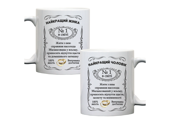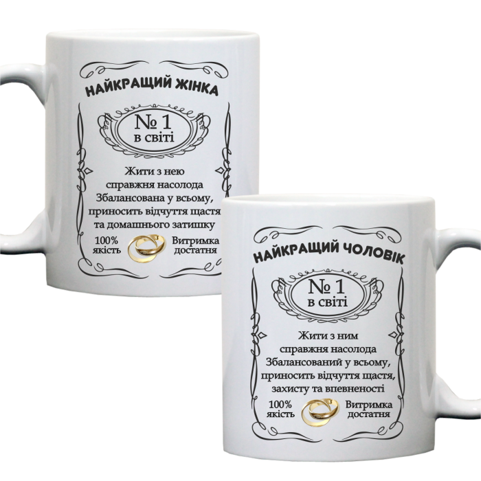 Парні чашки мають спільну ідею дизайну, малюнки та тексти на парних гуртках мають підкреслюють єднання двух люблячих сердець. Парні горнятка підійдуть для одружених пар та закоханих. За бажанням ви можете безкоштовно виправити текст - додати свої імена, дату та/або спільну фотографію зі зворотного боку чашок.